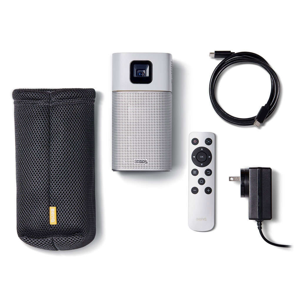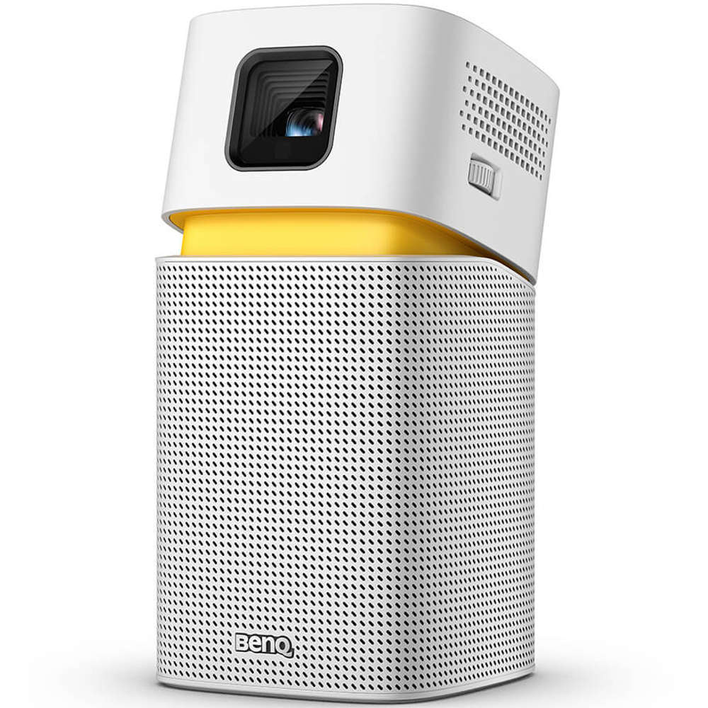 BENQ GV1 е джобен мини проектор, идеален за домашни забавления ако го използвате с малка аудитория. Независимо дали искате да се забавлявате с децата, да го вземете с вас на къмпинг или да гледате любимите си футболни мачове в градината, GV1 се пренася лесно и се настройва без проблеми. Мини проекторът е с тегло само 0.7 кг, можете да го поставите в чантата си, когато сте в движение и дори идва със собствен калъф за съхранение. Свързва се безжично чрез Wi-Fi и е с вграден Bluetooth говорител- просто свържете своя смартфон или лаптоп към него чрез кабел или безжично и можете да гледате любимите си филми и телевизионни предавания. Свързван с WiFi, ще можете да използвате Apple AirPlay ако сте с iOS устройство, а ако сте с Android, ще можете да използвате Google Cast. Високоговорителят и проекторът елегантно са разделени от ярка жълта лента. Прожекционният апарат може да се накланя нагоре до 15 градуса, като изкривяванията на картината се регулират с автоматична трапецовидна корекция. Фокусирането е ръчно с пръстена отстрани, а размерът на картината се променя само с изместване на проектора по- близко или по-далече от прожекционния екран. На гърба на мини проектора са разположении два порта: един за захранващ адаптер и USB-C порт за свързване на съвместим смартфон или лаптоп. Можете да свържете и USB памет, за да проектирате снимки или видеоклипове. GV1 е окомплектован с дистанционно управление за навигация през менюто, както и за промяна на различни настройки.