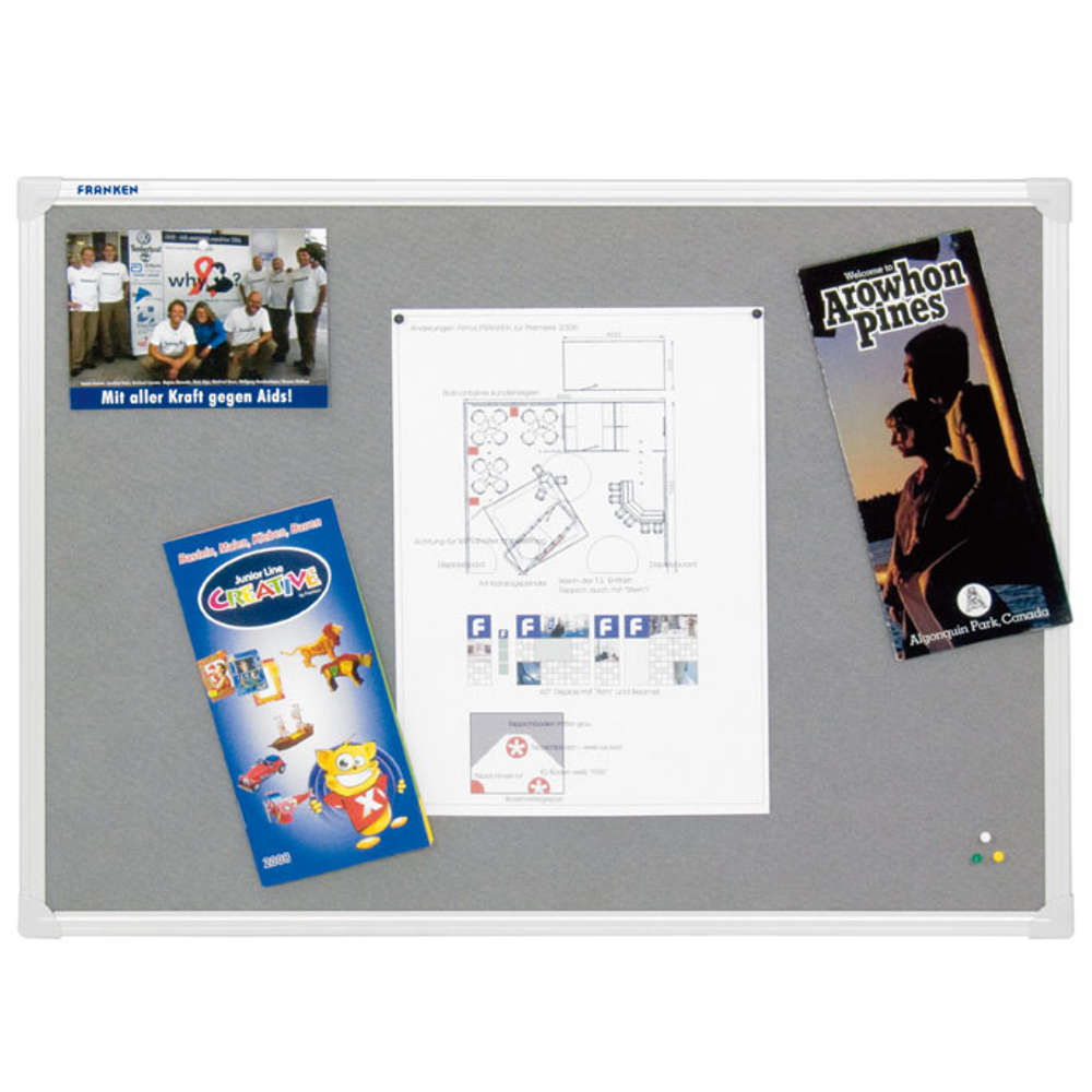 Franken PT230312 е елегантна коркова дъска, покрита със здрава филцова повърхност в сив цвят и сребриста анодизирана алуминиева рамка със светло сиви пластмасови ъгли, покриващи монтажните отвори. Филцовото покритие внася усещане за мекота и комфорт в офиса и класната стая. Корковата дъска е подходяща за прикрепване на бележки, снимки и разнообразни хартиени форми с пинчета. Разчупеният монтаж на Franken PT230312 (възможност за хоризонтално и вертикално монтиране-портретен или пейзажен формат) и възможността да бъдат комбинирани дъски с различен цвят на покритието, може да служи като акцент и да придаде завършеност на помещението.