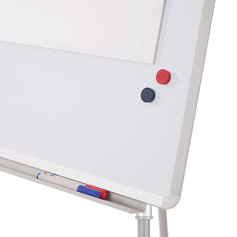 Магнитен флипчарт Bi-Office Economic EA2306315 с три крачета и рамка в сив цвят. Флипчартът е оборудван с бяла дъска с размери 70х100 см. с лесна за писане и почистване магнитна лакирана стоманена повърхност. В горната част на дъската можете да намерите здрав механизъм, подходящ за захващане на листа за флипчарт, а към цялата долна част на дъската е прикрепена удобна поставка за аксесоари-маркери, спрей, магнитчета и гъби за бяла дъска. По този начин флипчартът е чудесно средство за постигане на отлични резултати с комбиниране на различни методи за презентации и обучение-писане и рисуване директно върху бялата дъска или върху хартия, захваната с щипката, както и прикрепване на бележки и съобщения с магнитчета за бяла дъска. Флипчартът е с регулируема по височина стойка триножник, като крачетата могат да се сгъват за икономия на място когато флипчартът не се използва.