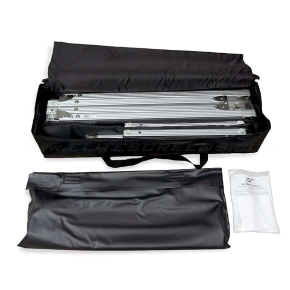 Прожекционният екран е предвиден за използване както за вътрешна, така и за външна употреба и е способен да издържи на лек вятър. В комплета са включени подвижни T-крака с фиксирана височина, колчета, въжета и опорни елементи за допълнително подсигуряване и стабилност при използването му на външни условия. Меката подплатена чанта улеснява пренасянето и съхранява целия продукт-екран, рамка и крака, както и осигурителните елементи.