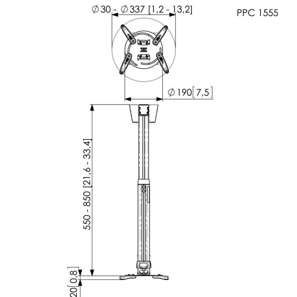 Vogel's PPC 1555 е регулируема по височина универсална стойка за мултимедийни проектори с тегло до 15 кг. в сребрист цвят с черни елементи. Височината се променя от минималното отстояние от тавана 57 см. до максималното 87 см,. като в тези граници може да се фиксира в желаната позиция за прецизно подравняване на проектора спрямо прожекционната повърхност. PPC 1555 се завърта на 360° и се накланя на 15°. Стойката предлага достатъчно пространство за всички необходими кабели и дава възможност да ги скриете в тръбата за секунди. Подходяща е за монтаж на плосък таван, скосен таван, гредоред или Н-носеща греда.