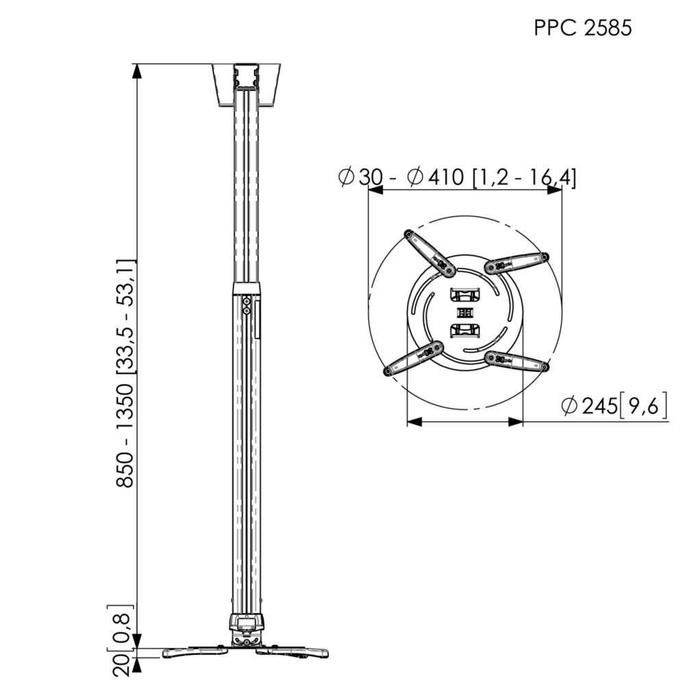 Vogel's PPC 2585 е регулируема по височина универсална стойка за мултимедийни проектори с тегло до 25 кг. в сребристо с черни елементи. Височината се променя от минималното отстояние от тавана 87 см. до максималното 137 см,. като в тези граници може да се фиксира в желаната позиция за прецизно подравняване на проектора спрямо прожекционната повърхност. РРС 2585 се завърта на 360° и се накланя на 15°. Стойката предлага достатъчно пространство за всички необходими кабели и дава възможност да ги скриете в тръбата на секунди. Подходяща е за монтаж на плосък таван, скосен таван, гредоред или Н-носеща греда.