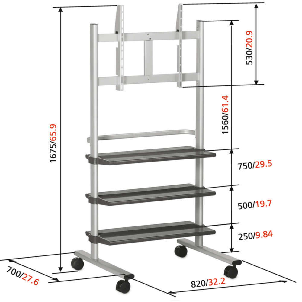Vogel's PB 150 е подвижна стойка (поставка) за телевизор за под с колелца, подходяща за монтаж 36 - 50 инча TV с максимално тегло 50 кг. TV стойката педлага три допълнителни рафта на отстояние от пода 25, 50 и 75 см. Vogel's PB 150 е устойчива метална стойка, перфектна за конферентни зали, класни стаи и офиси с максималната височината 167.5 см. и размери на основата 70х82 см.