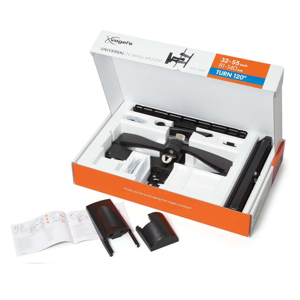 Стойка за телевизор за стена Vogel's WALL 3250 за 32-55" (81-140 см) TV. WALL 3250 е проектирана специално за телевизори с максимално тегло до 35 кг. Стойката е с уникалната конструкция с двойни опорни рамена и осигурява солиден монтаж с максимален ъгъл на завъртане 120° и максимален наклон 15°. Системата за защита на екрана не позволява на телевизора да докосва стената.