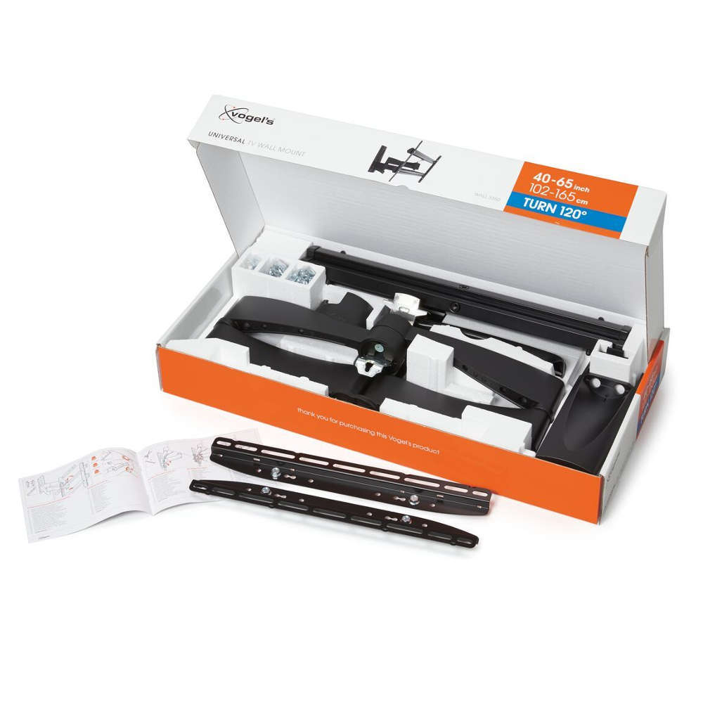 Стойка за телевизор за стена Vogel's WALL 3350 за 40" до 65" (101-165 см) TV. WALL 3350 е с качествена конструкция и елегантно покритие в черен цвят, предназначена за по-тежки телевизори с максимално тегло до 45 кг. Стойката е с уникалната конструкция с двойни опорни рамена, които позволяват да обръщате по-тежки телевизори до позицията, която харесвате и осигурява солиден монтаж с максимален ъгъл на завъртане 120° и максимален наклон 15°. Системата за защита на екрана не позволява на телевизора да докосва стената.