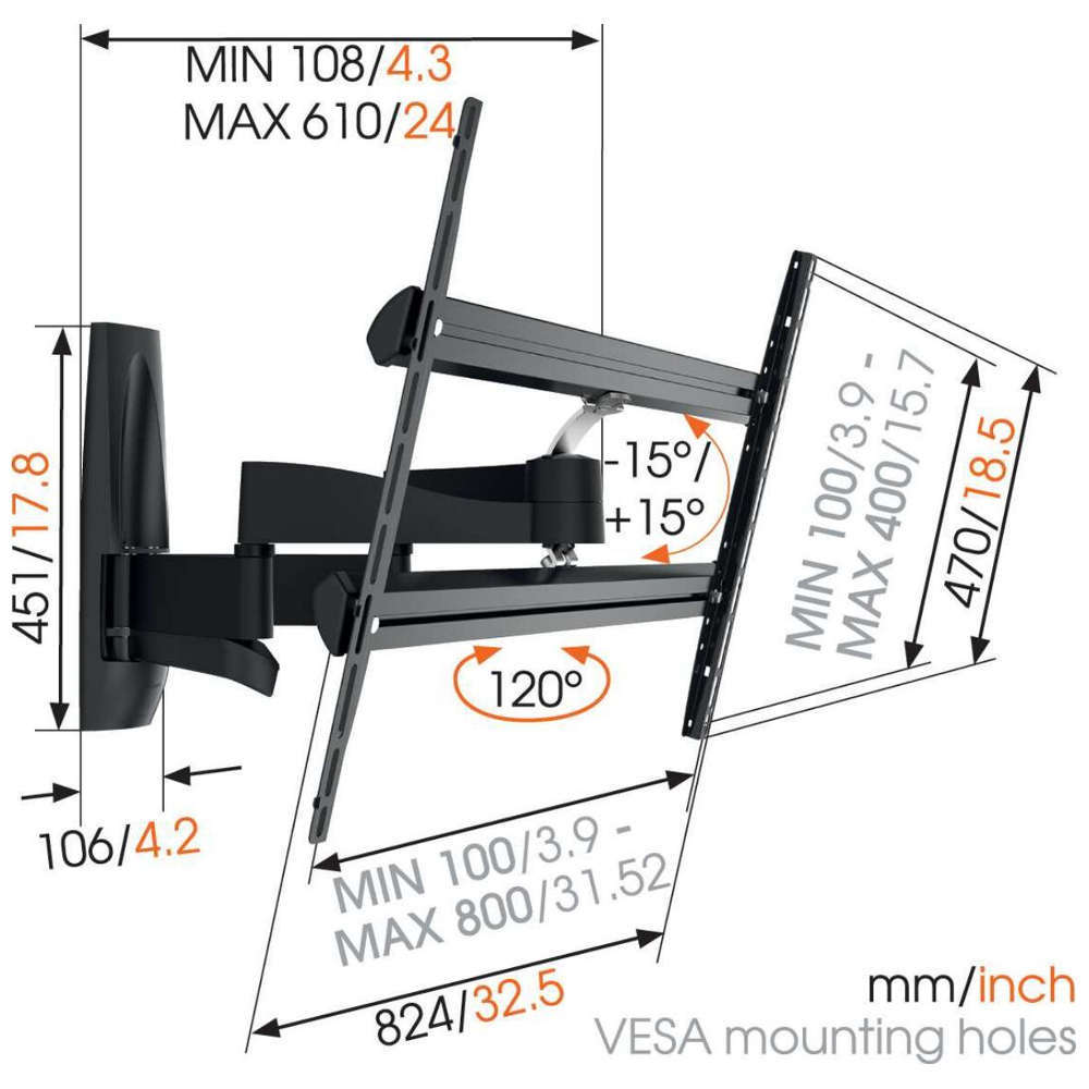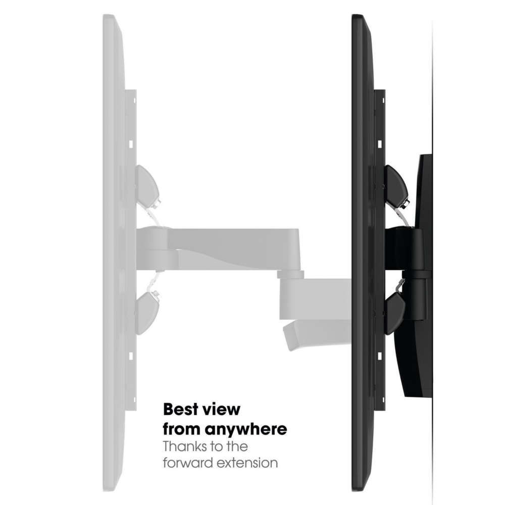 Универсална стойка за стенен монтаж на телевизори Vogel's WALL 3450, идеален избор за Smart TV, HDTV, 4K, LCD, Plasma, OLED, LED с диагонал от 55" до 100" (140-254 см). TV стойката е проектирана специално с двойни носещи рамена за големи и тежки телевизори с тегло до 55 кг. Стенната стойка е надеждно и просто решение с гарантирано качество на Vogel's, като позволява практично накланяне от 15° (надолу), завъртане до 120° (60° ляво и дясно) и удължаване до 61 см. Приложението TV Mount Guide (Android и iOS) ви превежда през процеса на инсталиране и помага да намерите идеалната позиция на телевизора на стената.
