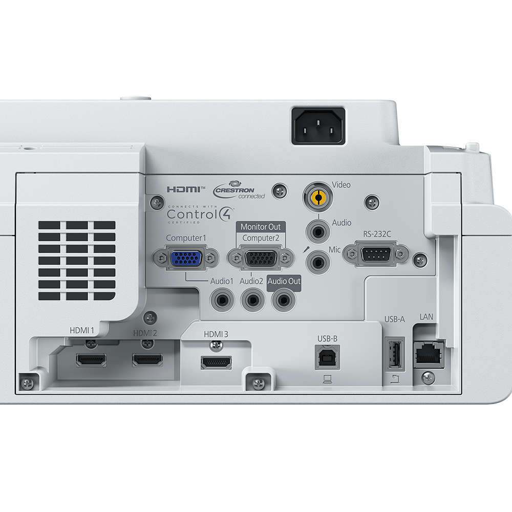 Моделът е оборудван с богат интерфейс за кабелно свързване с външни устройства, включително с три HDMI входа, три аудио входа и жак за аудио изход. Двойка интегрирани 8-ватови високоговорители ще свършат чудесна работа за класна работа, а като бонус е включването на микрофонен вход. Свързвайки опционалната камера за документи на Epson, можете лесно да показвате 3D обекти с висока детайлност.